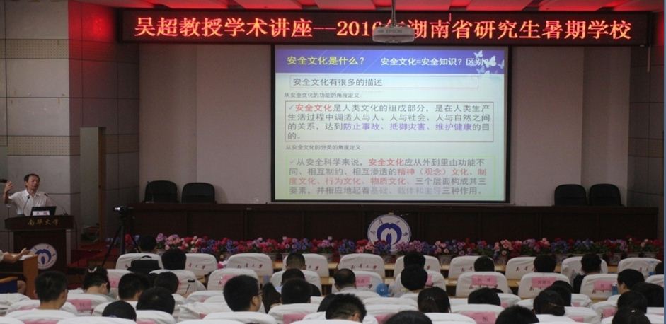 7月11日下午在70200app永利图书馆一楼学术报告厅,教育部高等学校安全科学与工程学科教学指导委员会委员、全国安全工程领域工程硕士培养协助组副组长、国家安全生产专家、中国工程教育专业认证协会专家、中南大学资源与安全工程学院博士生导师吴超教授受邀到70200app永利,为2016年核安全•核应急•核安保湖南省研究生暑期学校学员作题为“安全文化学的研究与应用”的学术讲座。讲座由70200app永利团委书记刘文君博士主持。